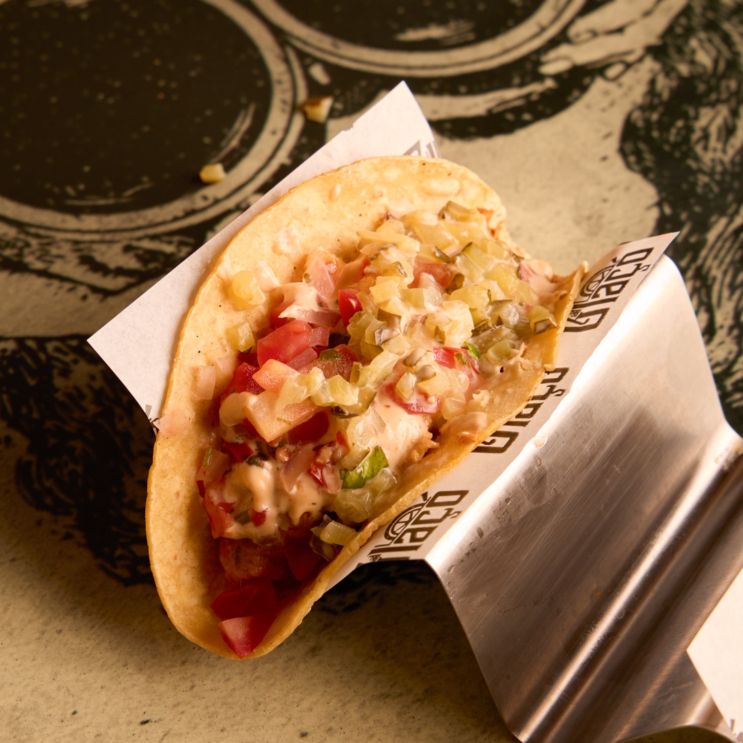 Carne estilo mexicano ‘Pibil’, Pepinillos, Lima, Mayonesa Siracha y pico de gallo. Un bacado muy exclusivo.